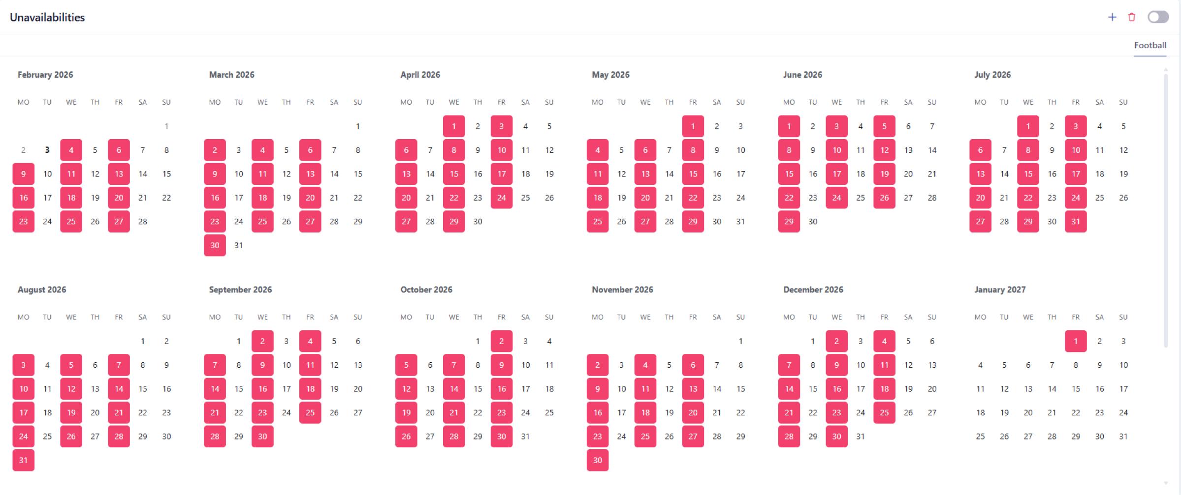 Match officials can now add recurring unavailabilities for large periods of time. Thanks to this functionality, they save time and the possibility of human errors is drastically reduced.
