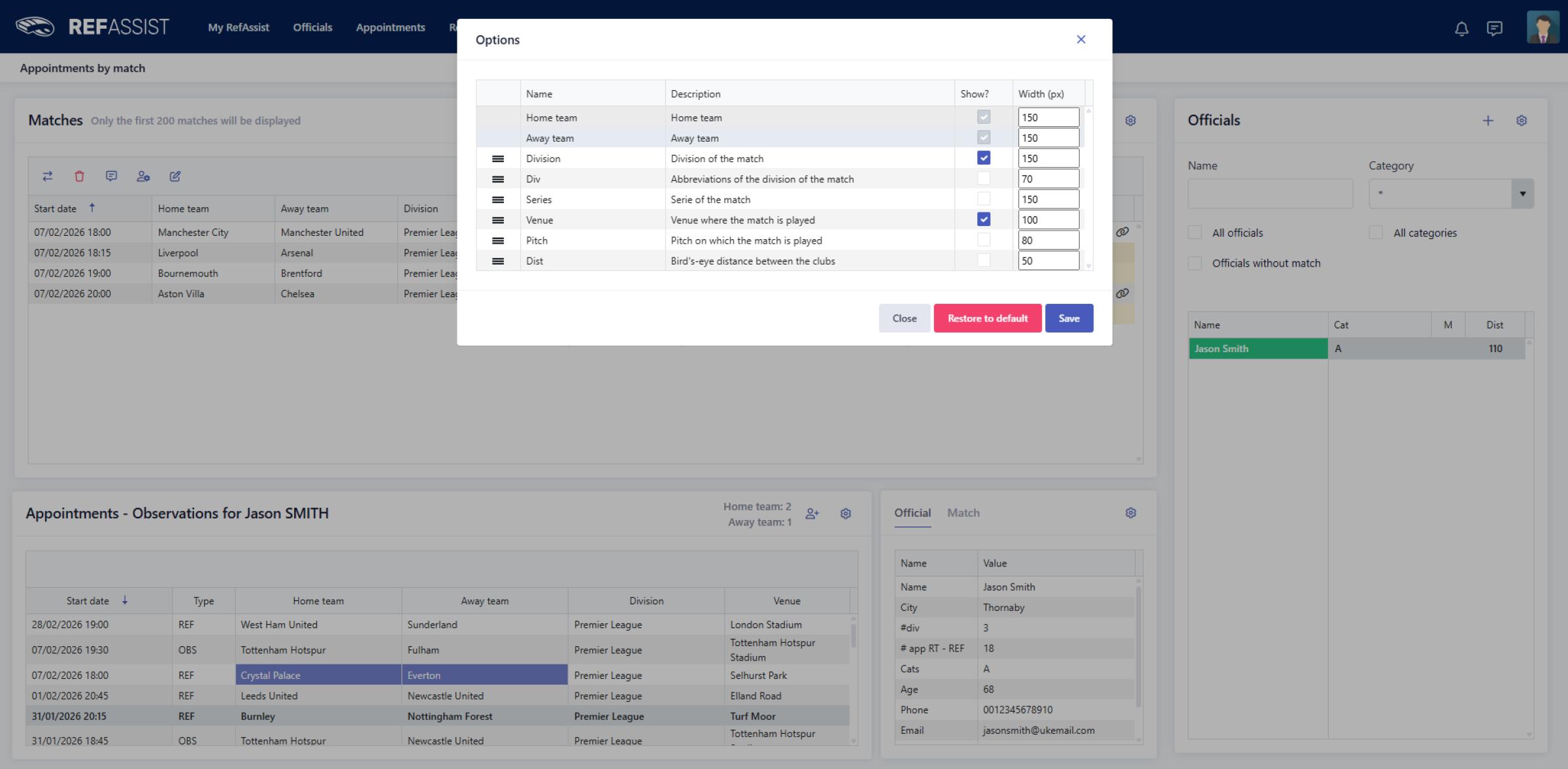 You can now customise the columns in the following screens: appointments for match, official management, financial management and match report management.