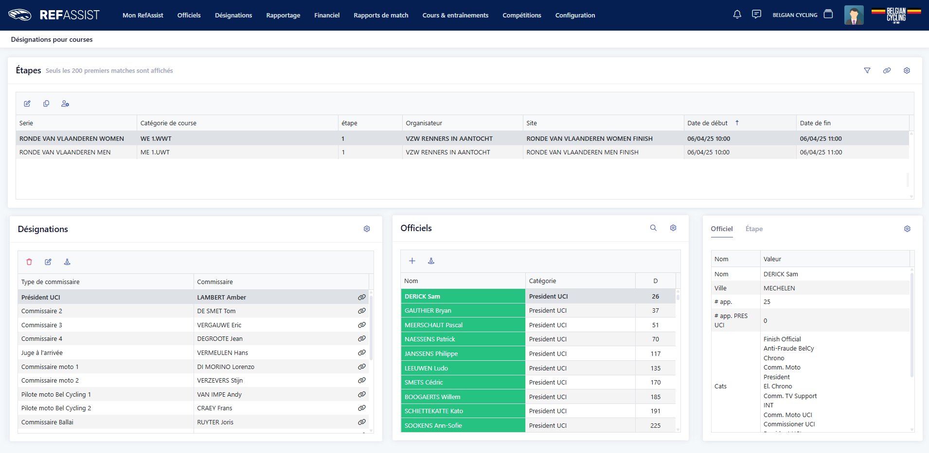 Grâce à RefAssist, Belgian Cycling a déjà désigné plus de 1 500 courses réparties sur huit disciplines cyclistes. Pour chaque étape, des configurations ont été définies concernant les types de commissaires requis ainsi que les indemnités de désignation correspondantes. Les frais de transport et les indemnités par étape sont calculés automatiquement.