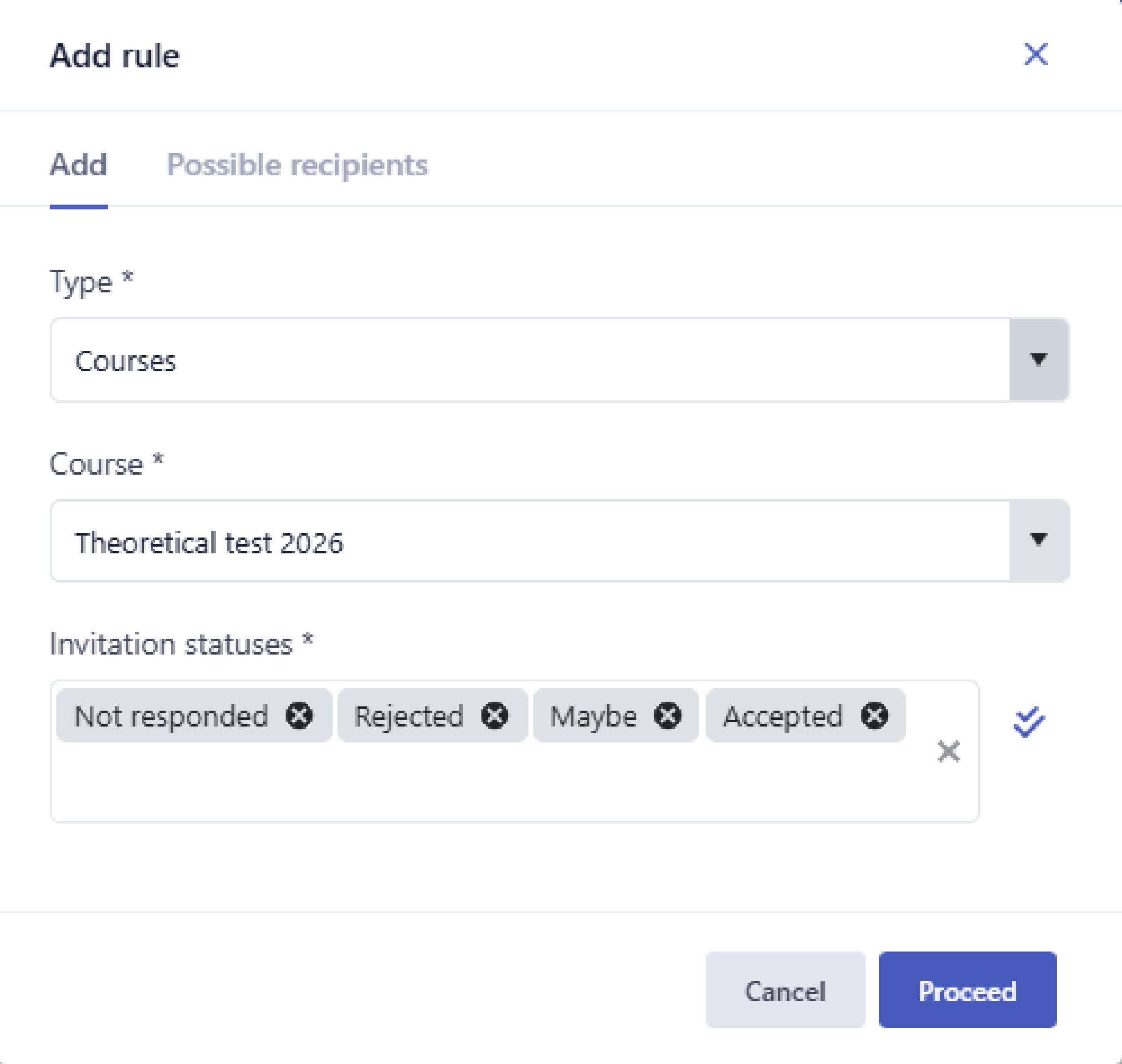 Il est désormais possible d'envoyer des messages aux officiels invités à un cours spécifique via notre fonctionnalité Dossiers & Messages. Vous pouvez voire filtrer les participants selon les statuts de leurs invitations: Pas répondu, Refusé, Peut-être ou Accepté.